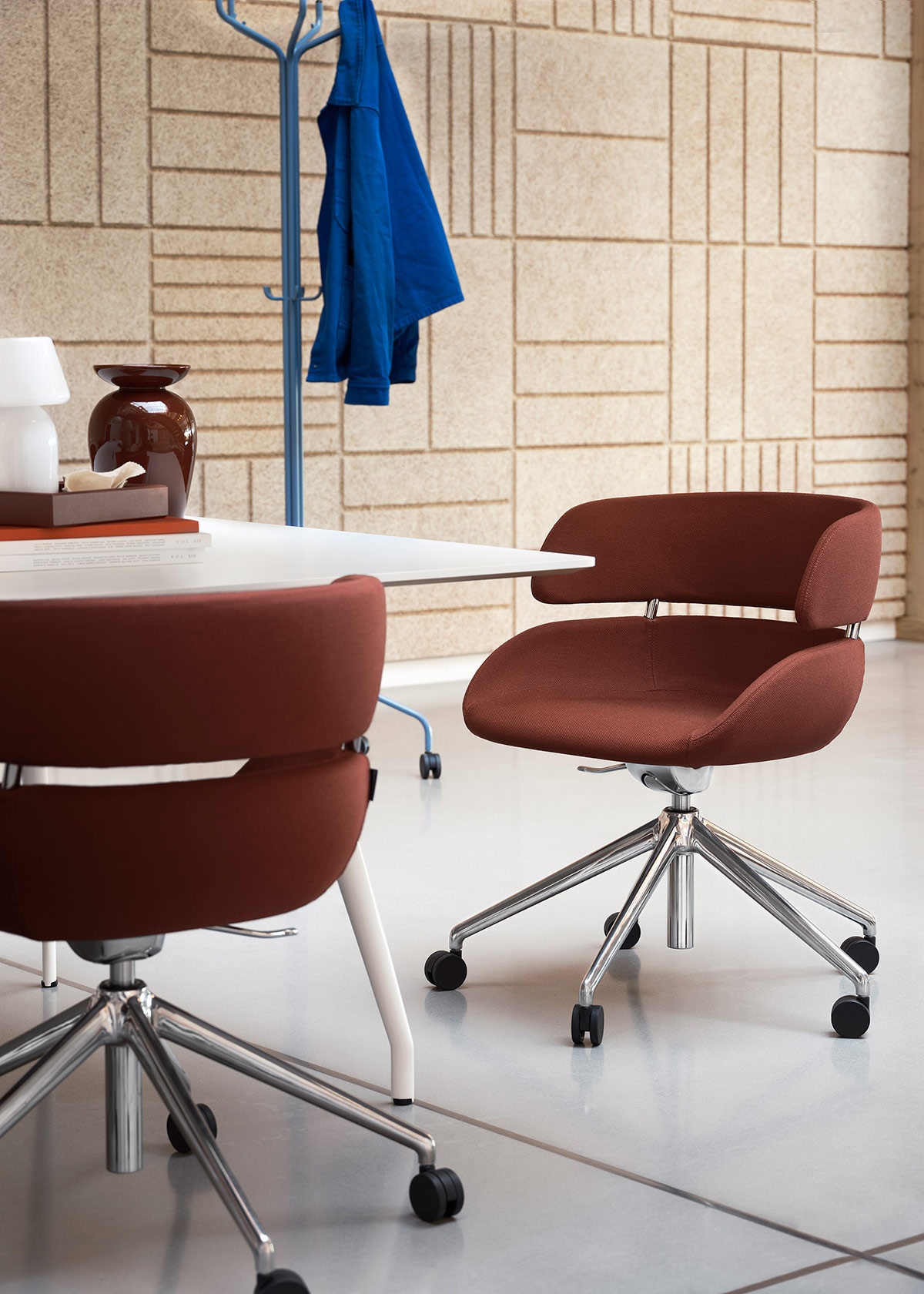 This version introduces a height adjustable base on castors, allowing the chair to adapt to more dynamic work environments. The adjustable seating position makes it suitable for different users and tasks while keeping the same embracing comfort as the original Fendo chair.