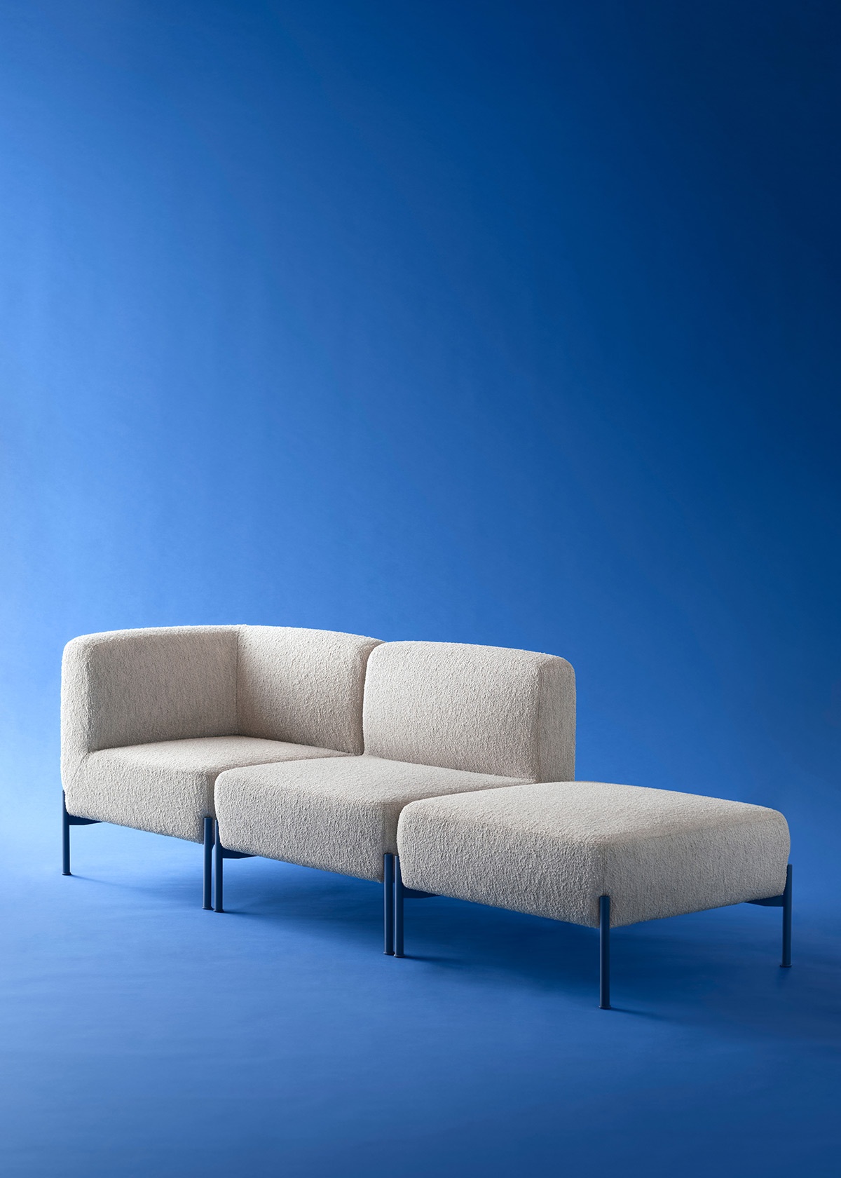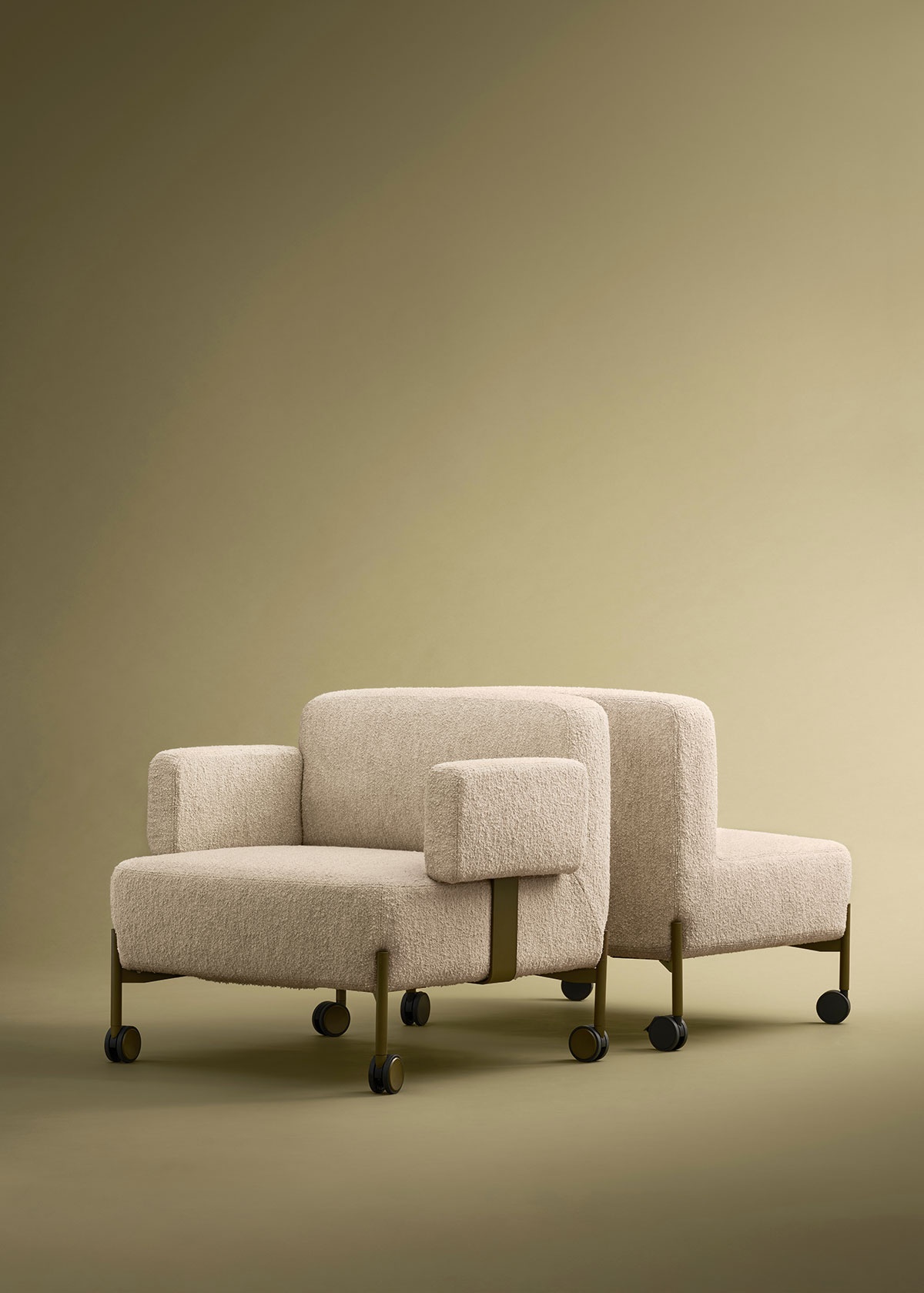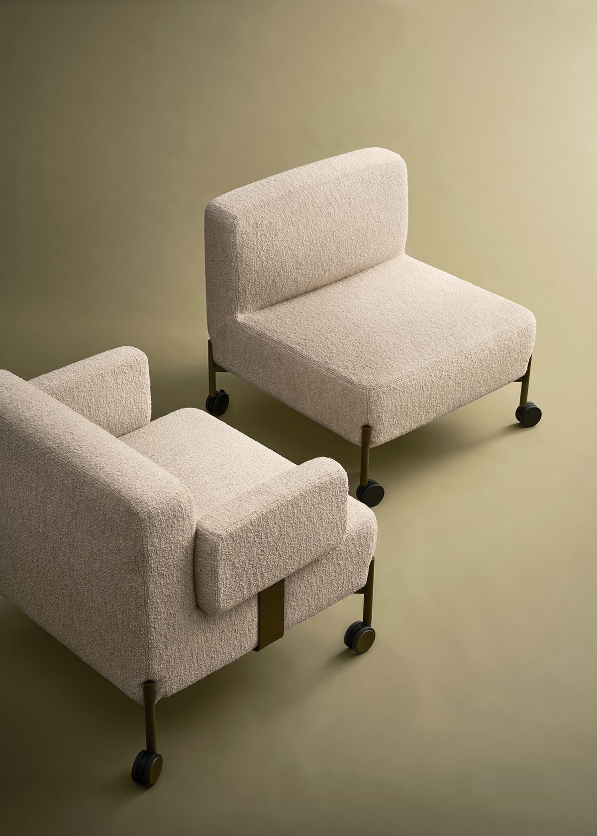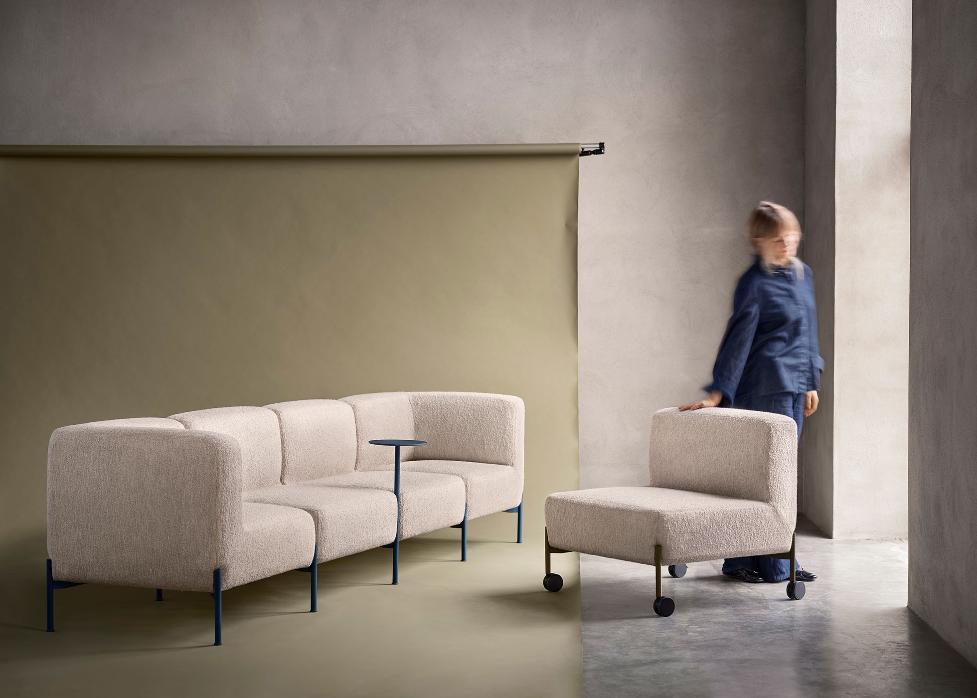 RUTAN develops the RUT system into a lighter and more flexible expression. The same upholstered modules are used, but instead of resting on a beam, they stand on slender steel legs. This shift changes how the furniture behaves in a room. It becomes more open, easier to move and reconfigure, especially in versions with castors, while keeping the same clear geometry and comfort.