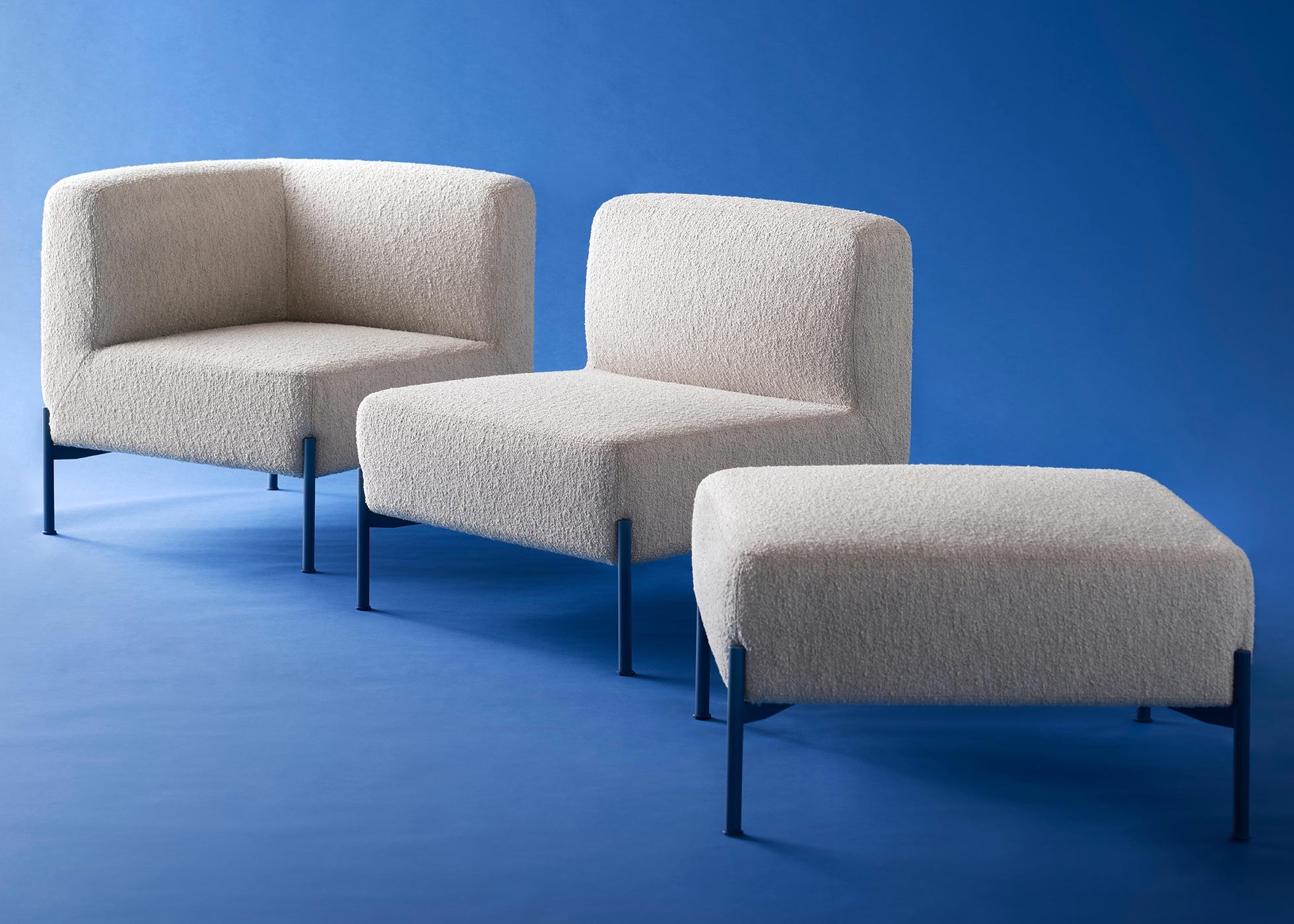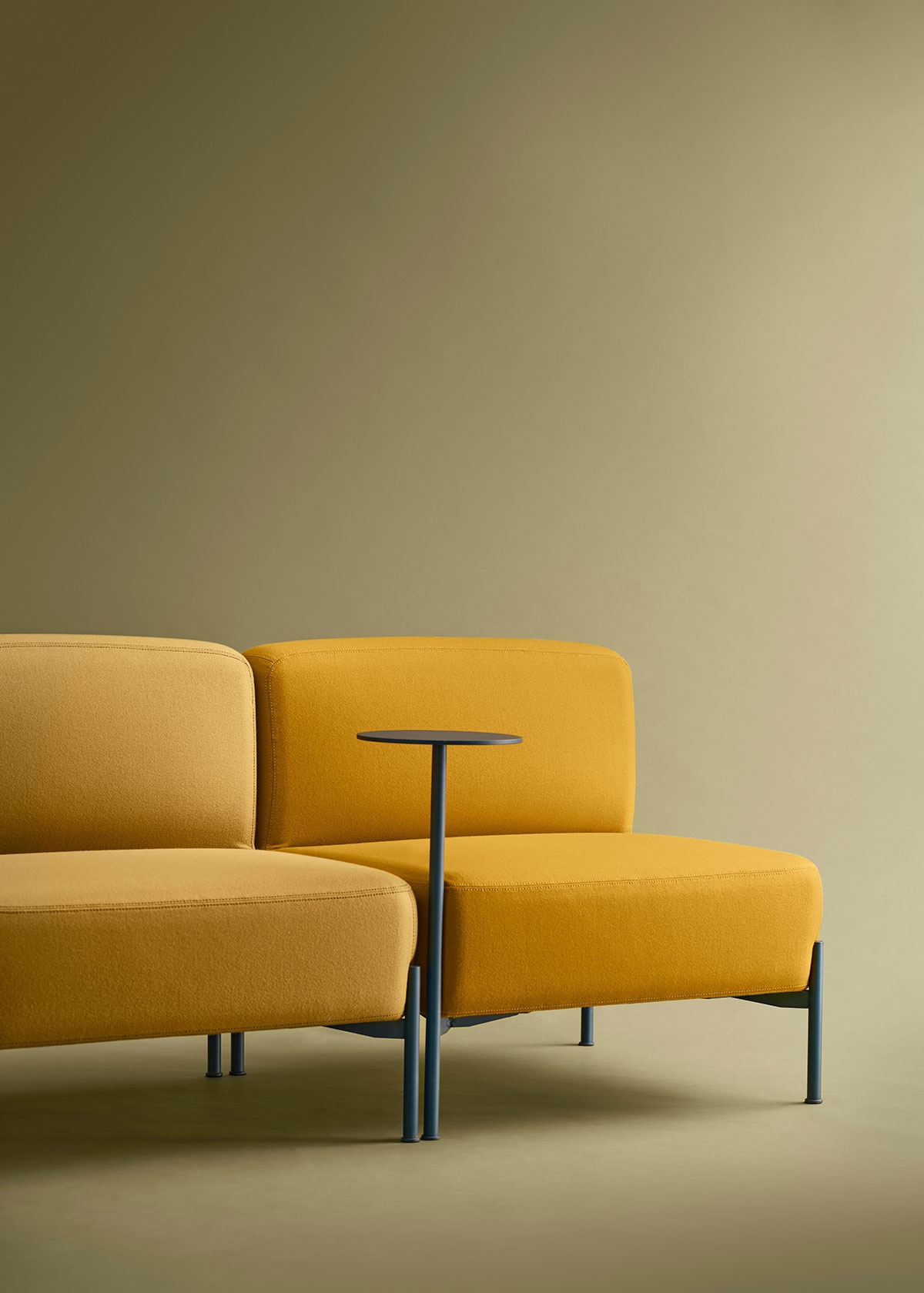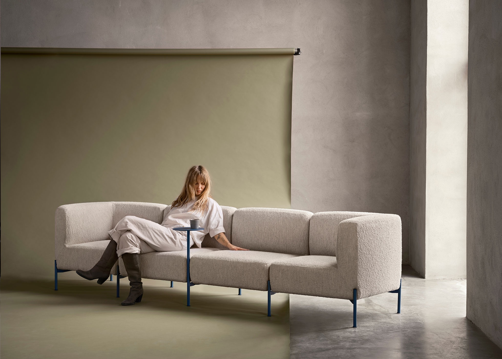 RUTAN develops the RUT system into a lighter and more flexible expression. The same upholstered modules are used, but instead of resting on a beam, they stand on slender steel legs. This shift changes how the furniture behaves in a room. It becomes more open, easier to move and reconfigure, especially in versions with castors, while keeping the same clear geometry and comfort.