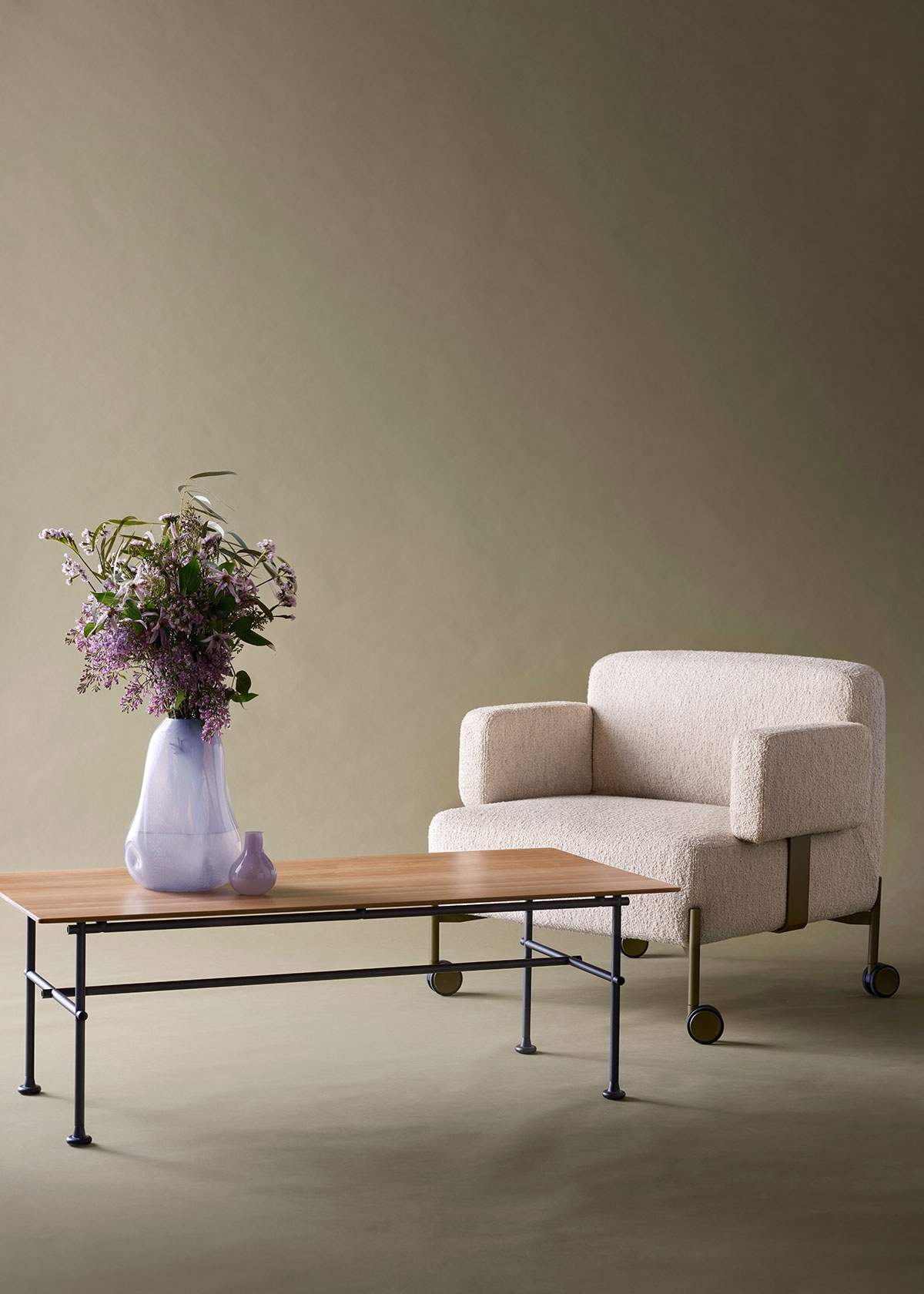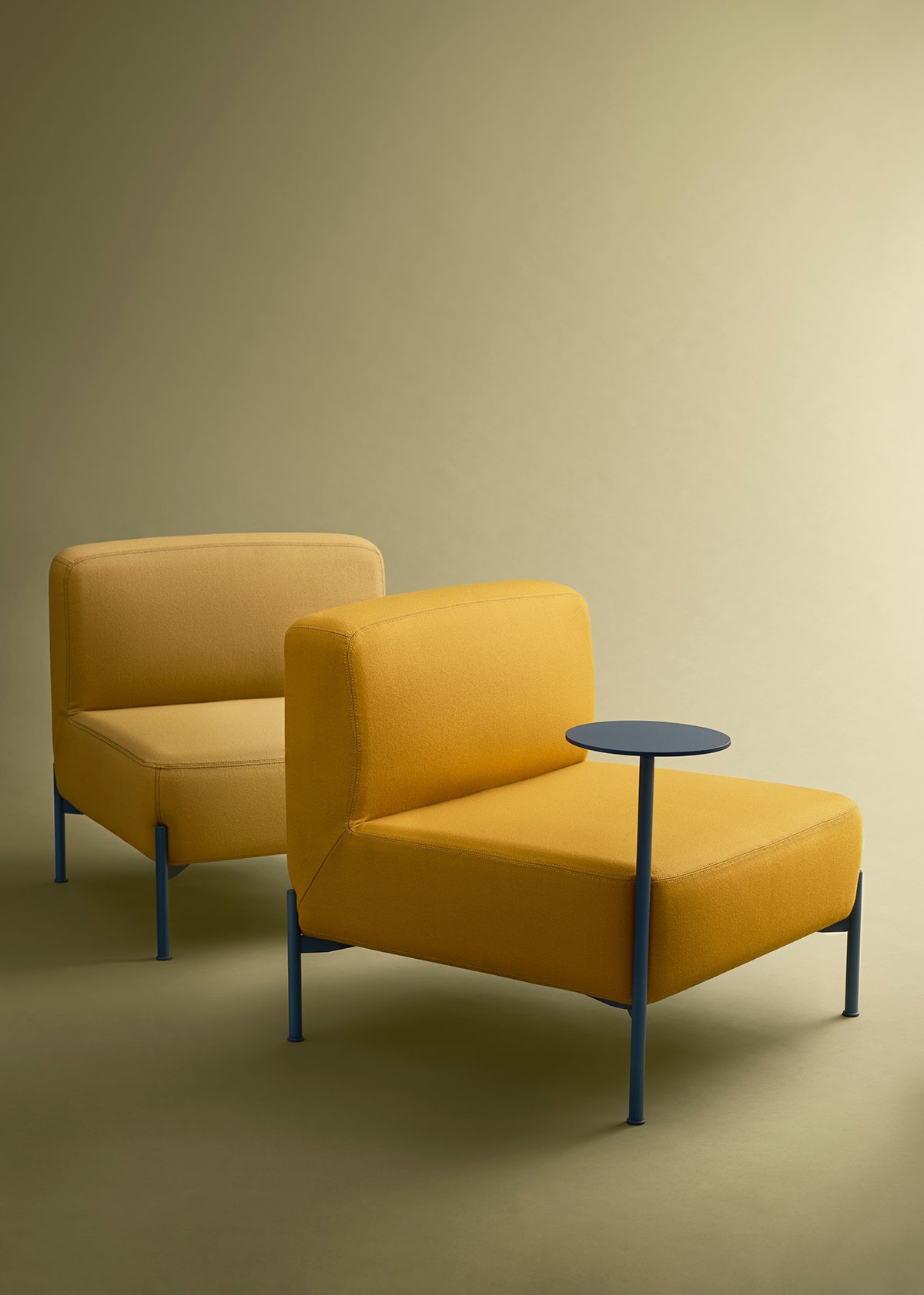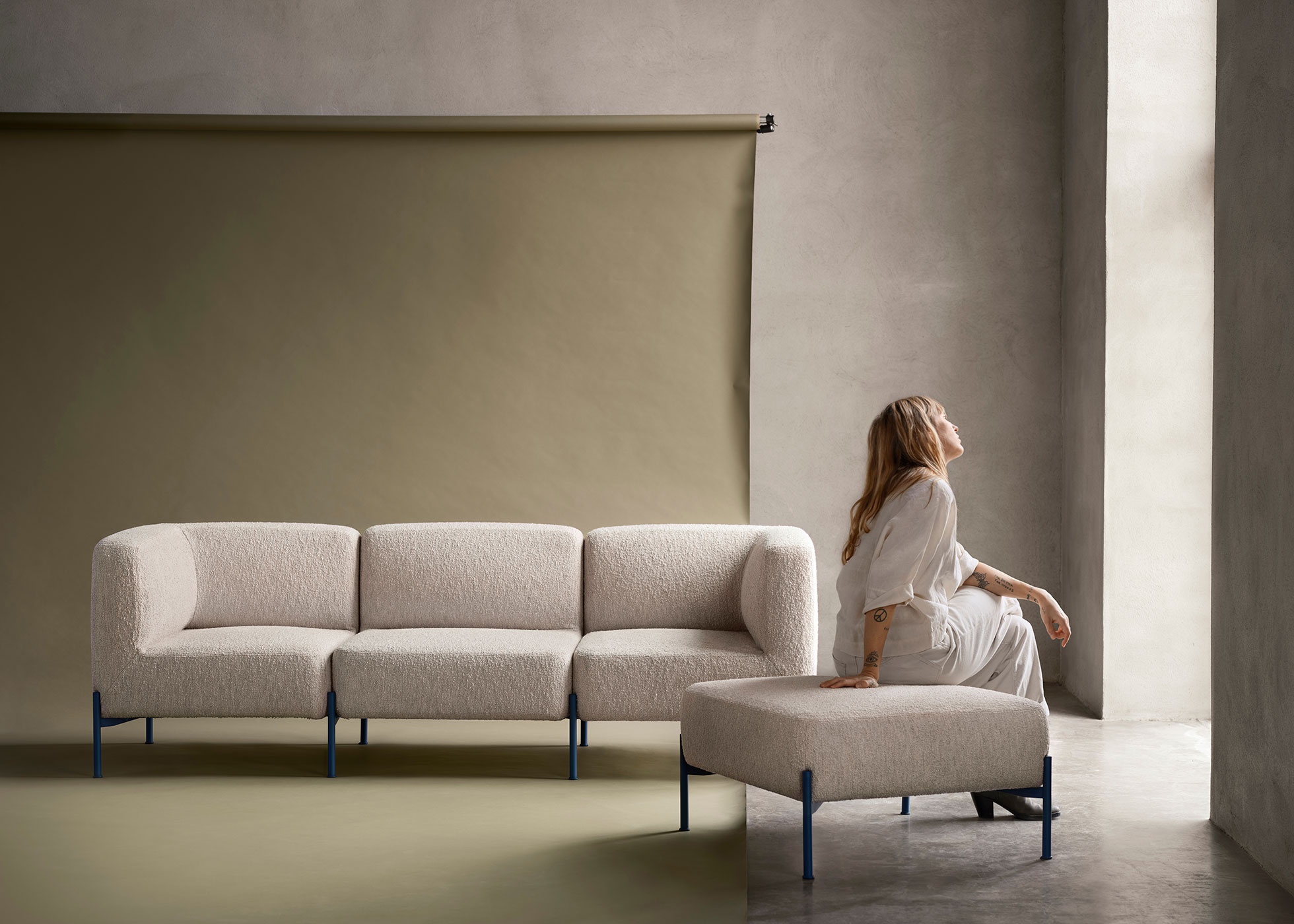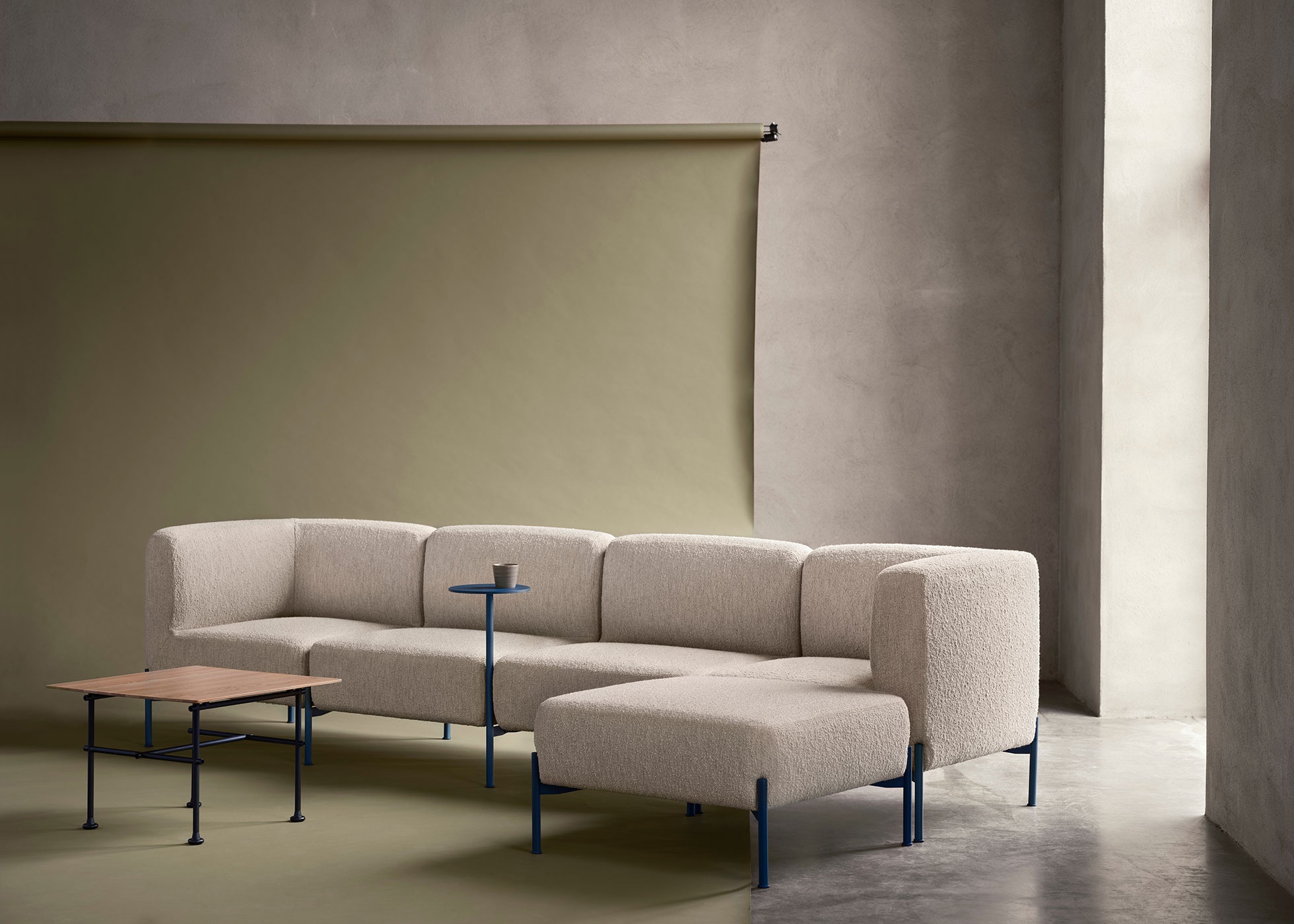 RUTAN develops the RUT system into a lighter and more flexible expression. The same upholstered modules are used, but instead of resting on a beam, they stand on slender steel legs. This shift changes how the furniture behaves in a room. It becomes more open, easier to move and reconfigure, especially in versions with castors, while keeping the same clear geometry and comfort.