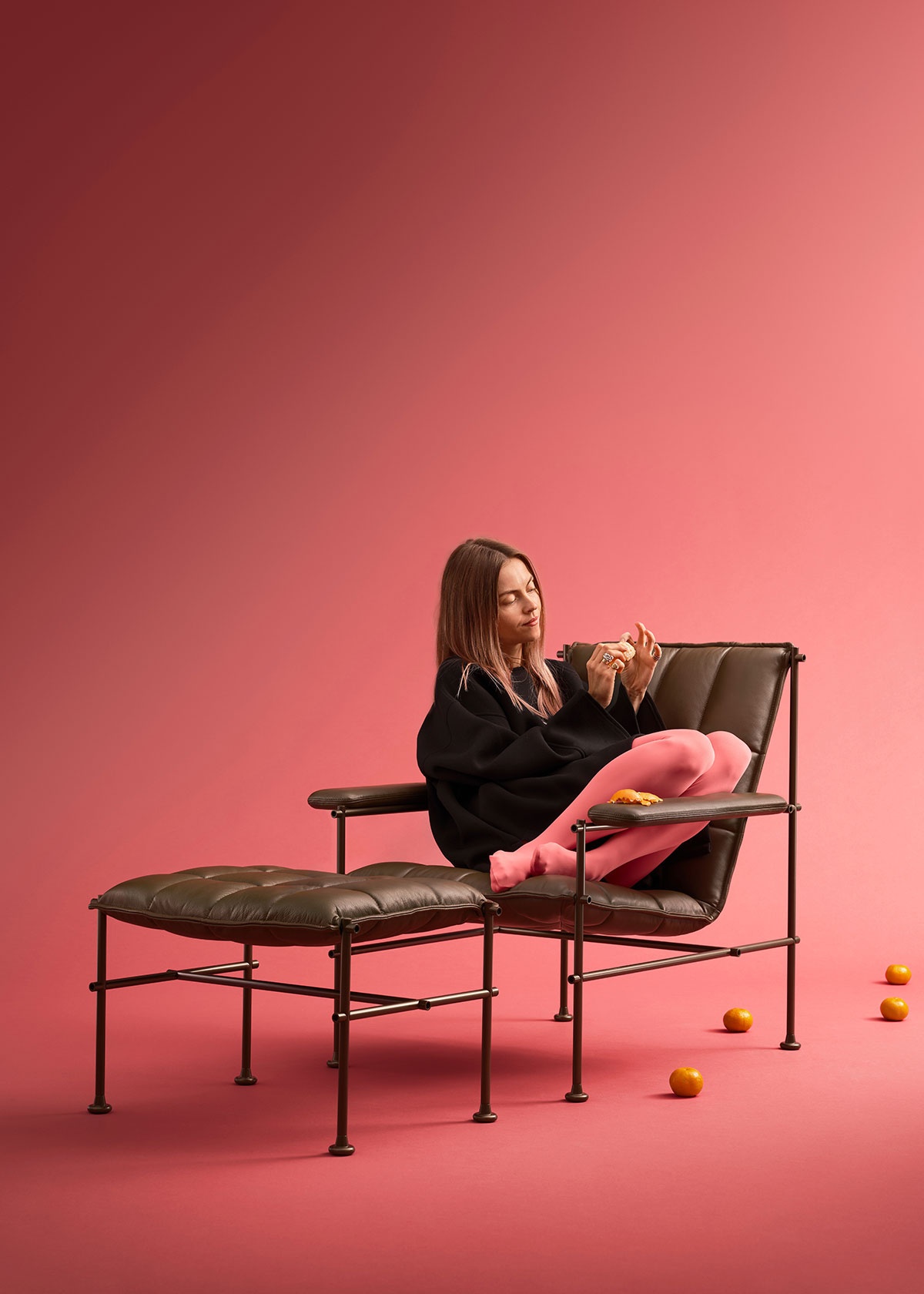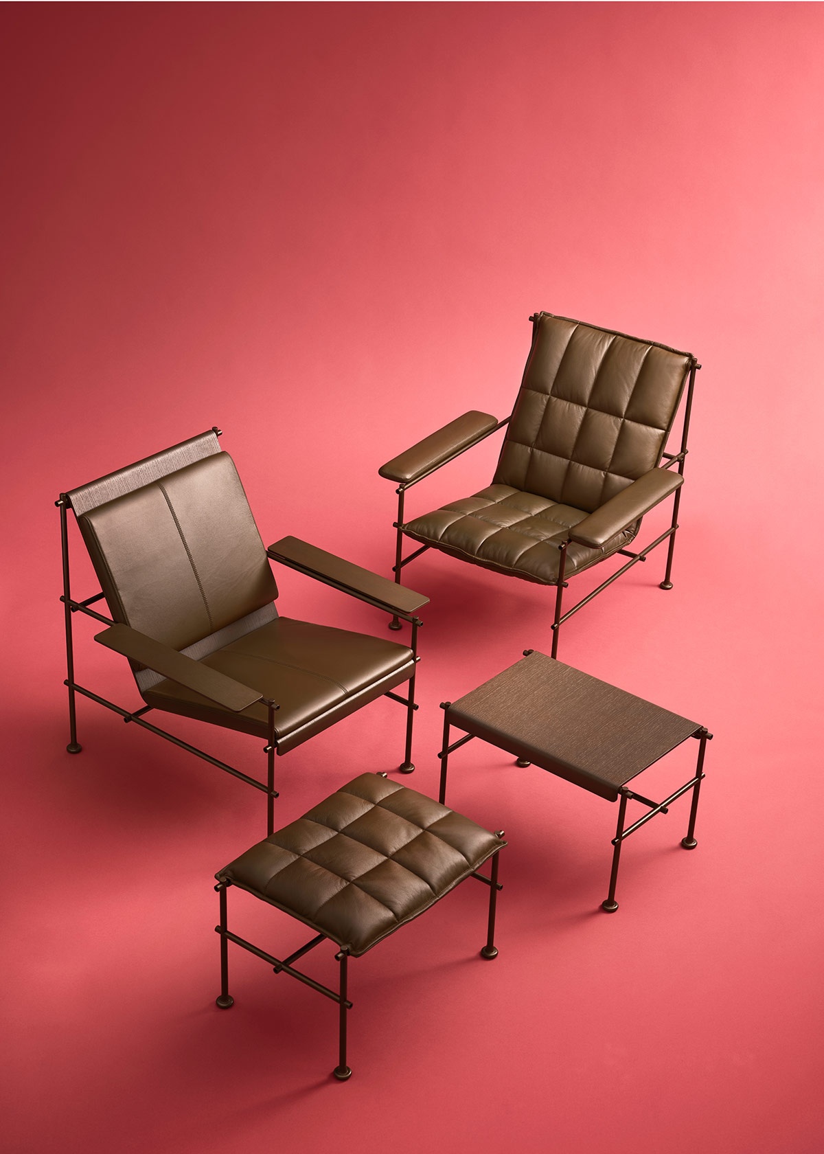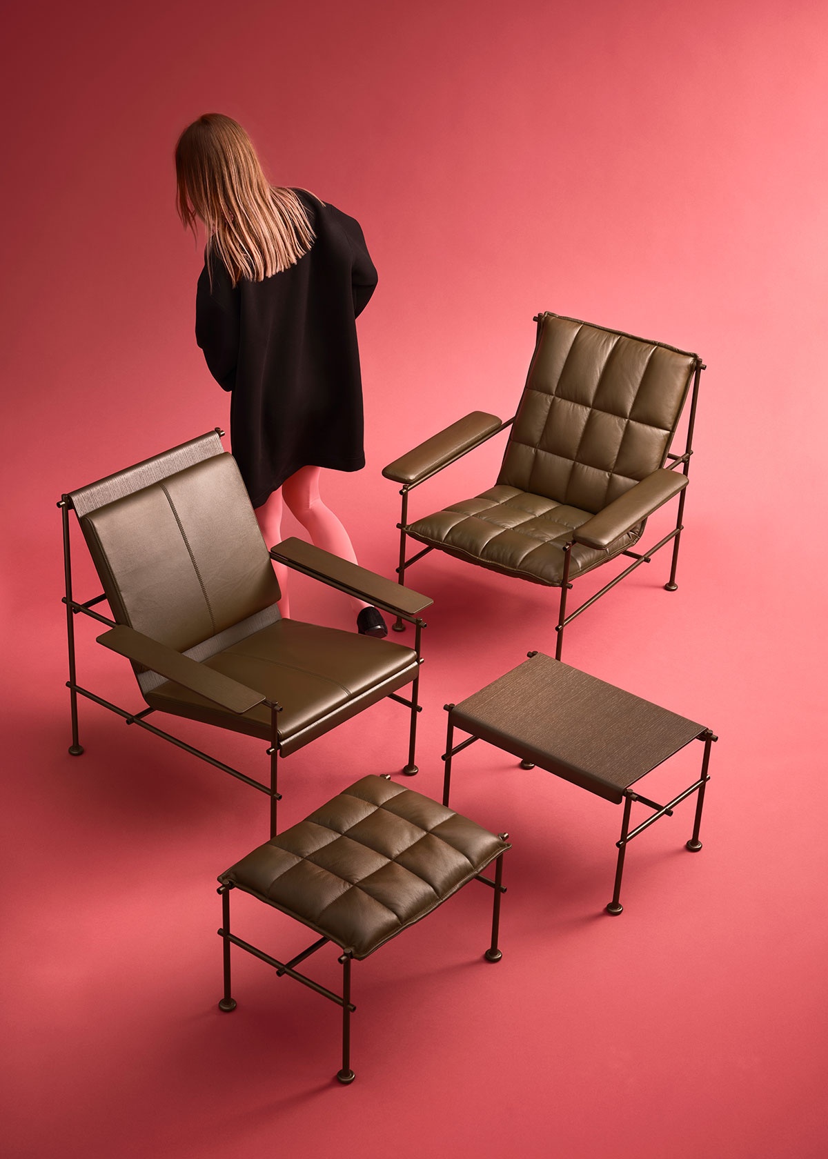 Villhem is a family of furniture built around a clear structural idea. A visible metal frame forms the construction, while different seating solutions and tables are developed within the same system.