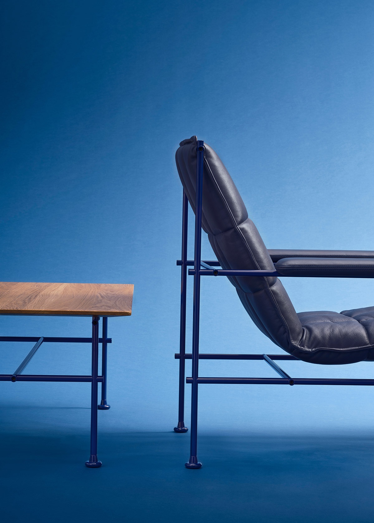 Villhem is a family of furniture built around a clear structural idea. A visible metal frame forms the construction, while different seating solutions and tables are developed within the same system.