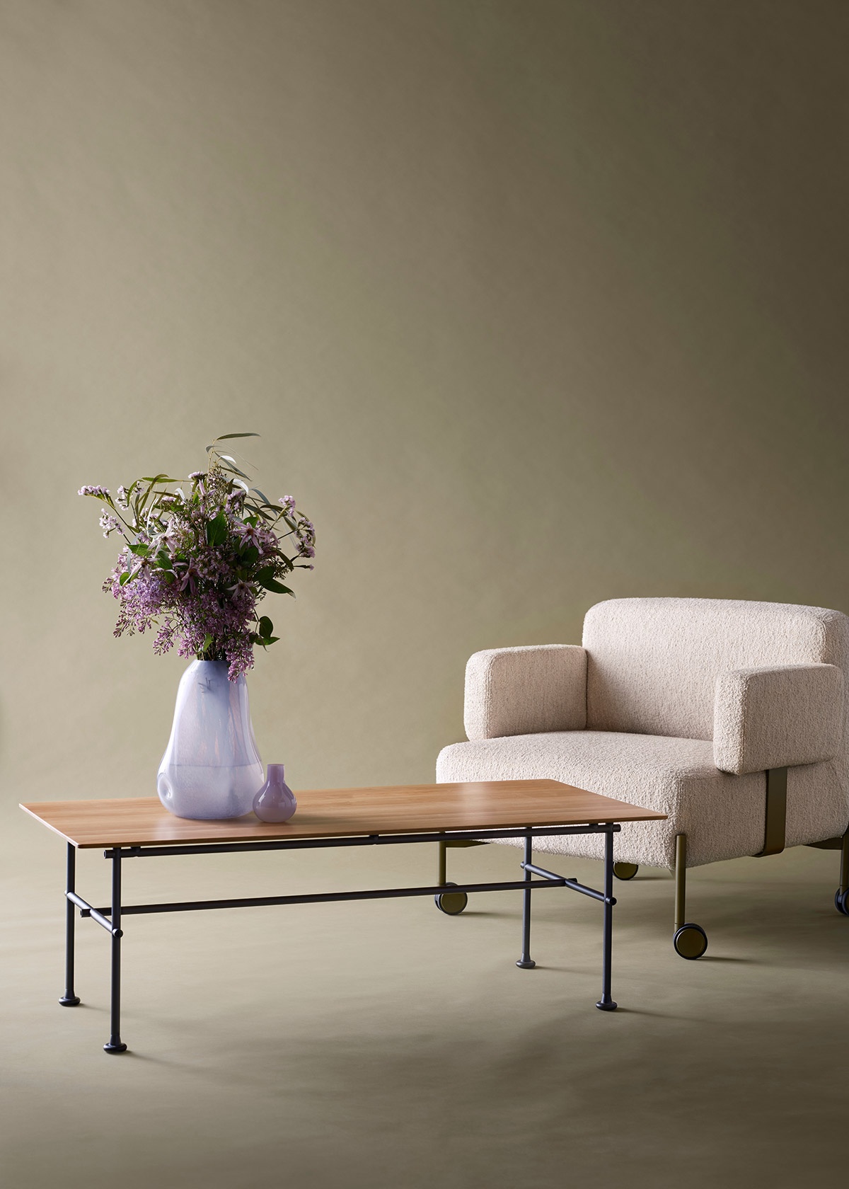 Villhem is a family of furniture built around a clear structural idea. A visible metal frame forms the construction, while different seating solutions and tables are developed within the same system.