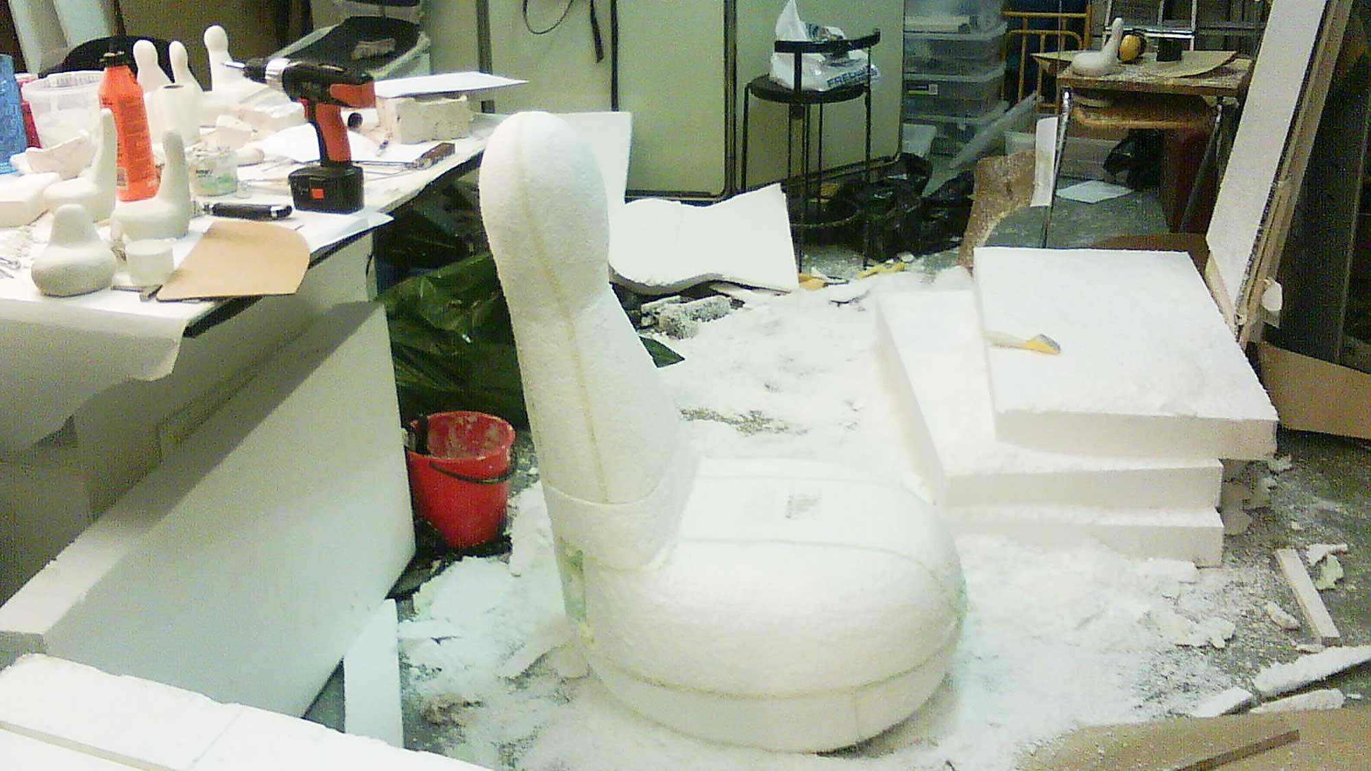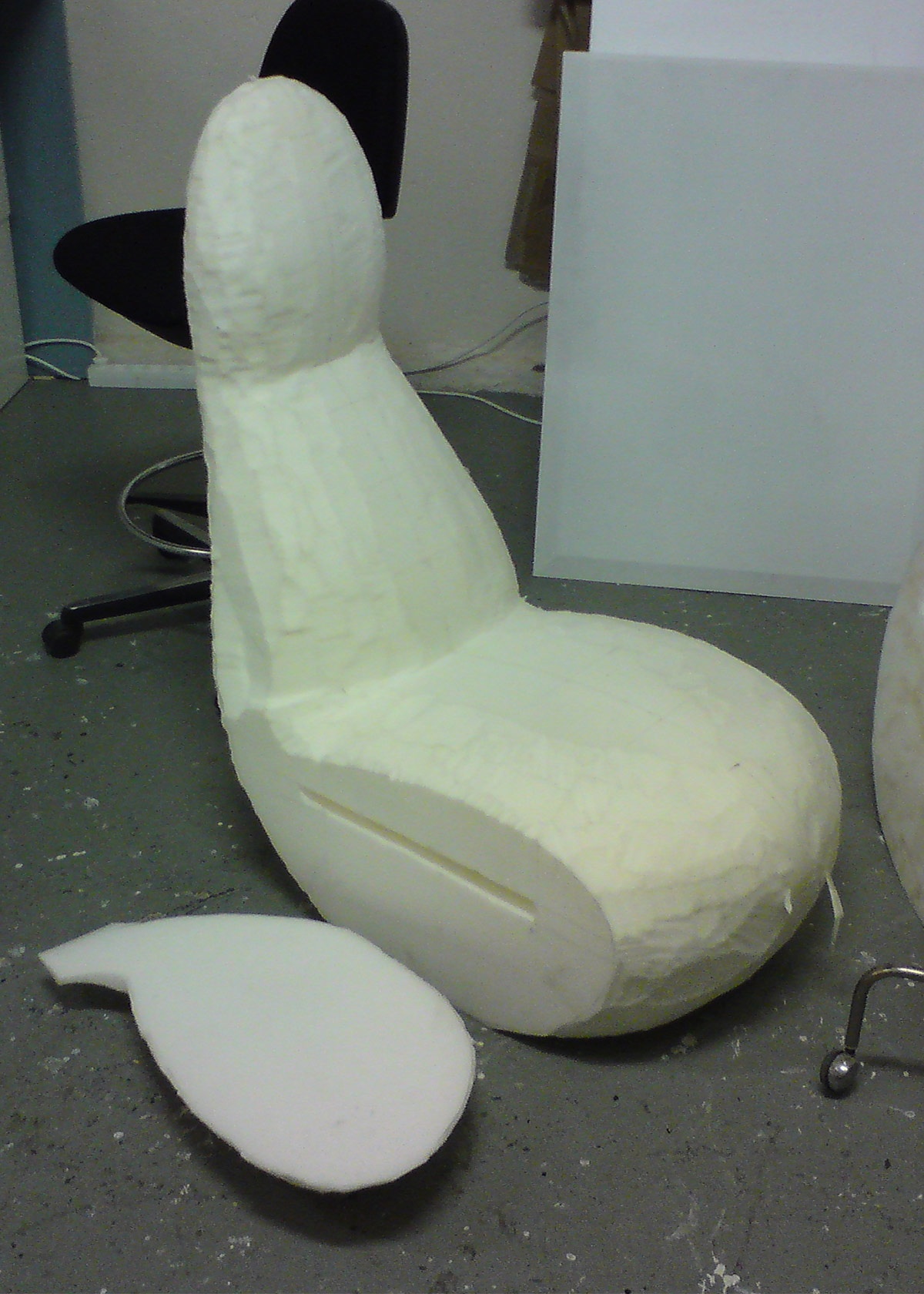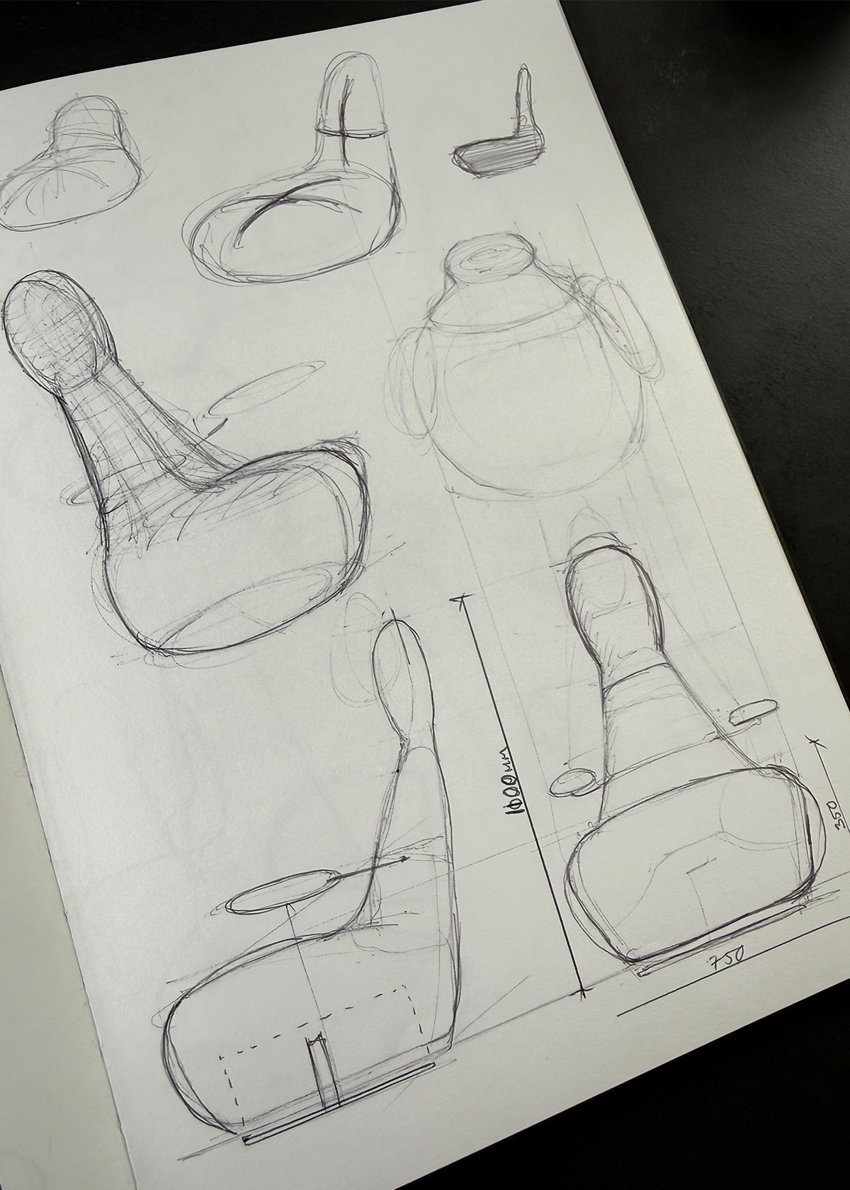 The development moved between sketches, scale models and full-scale prototypes. I worked with clay to shape the initial volumes, followed by larger models in foam and soft materials to test proportions and comfort. Once the form was established, I scanned the model and continued the development digitally, refining the geometry and constructing the internal structure.