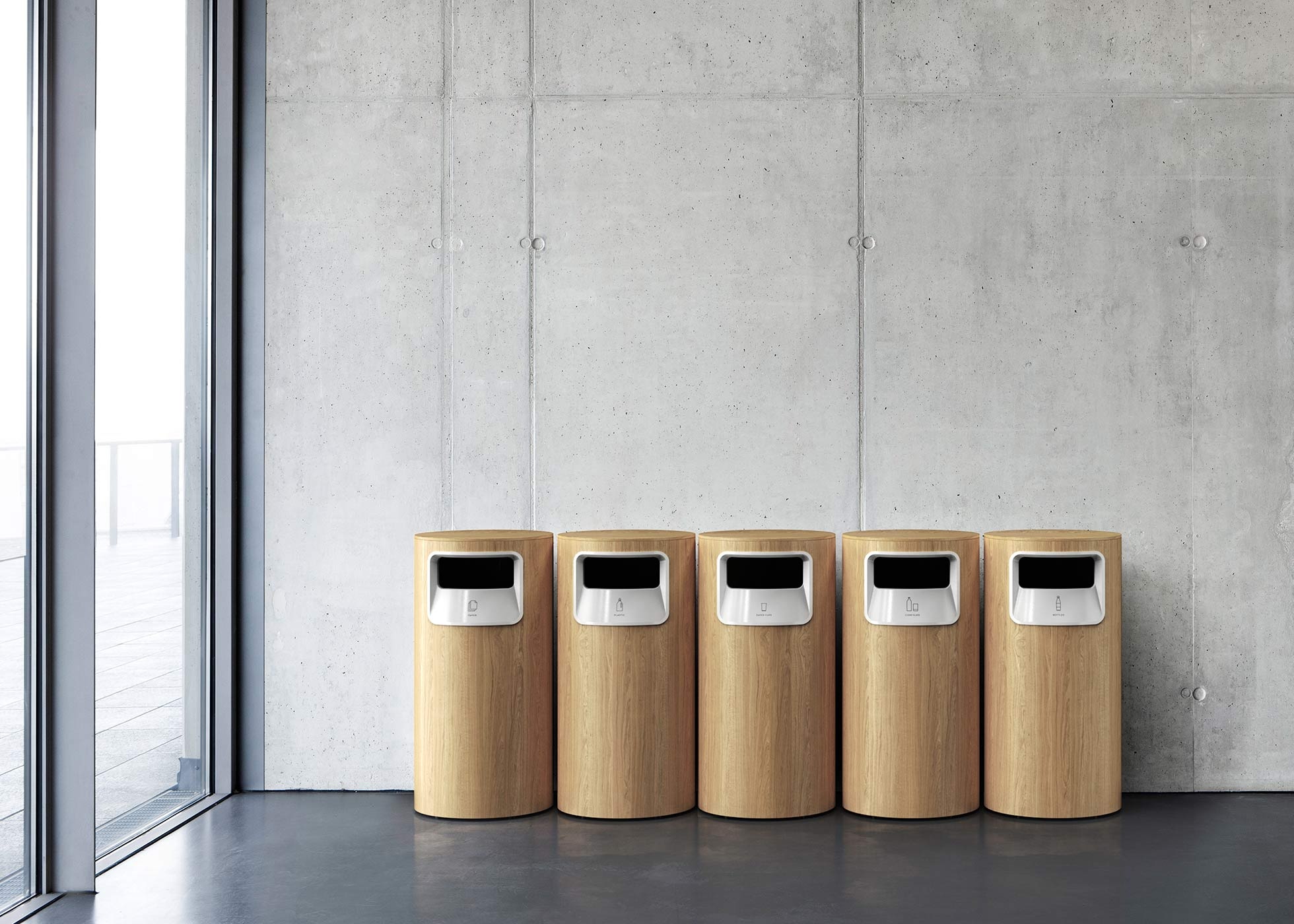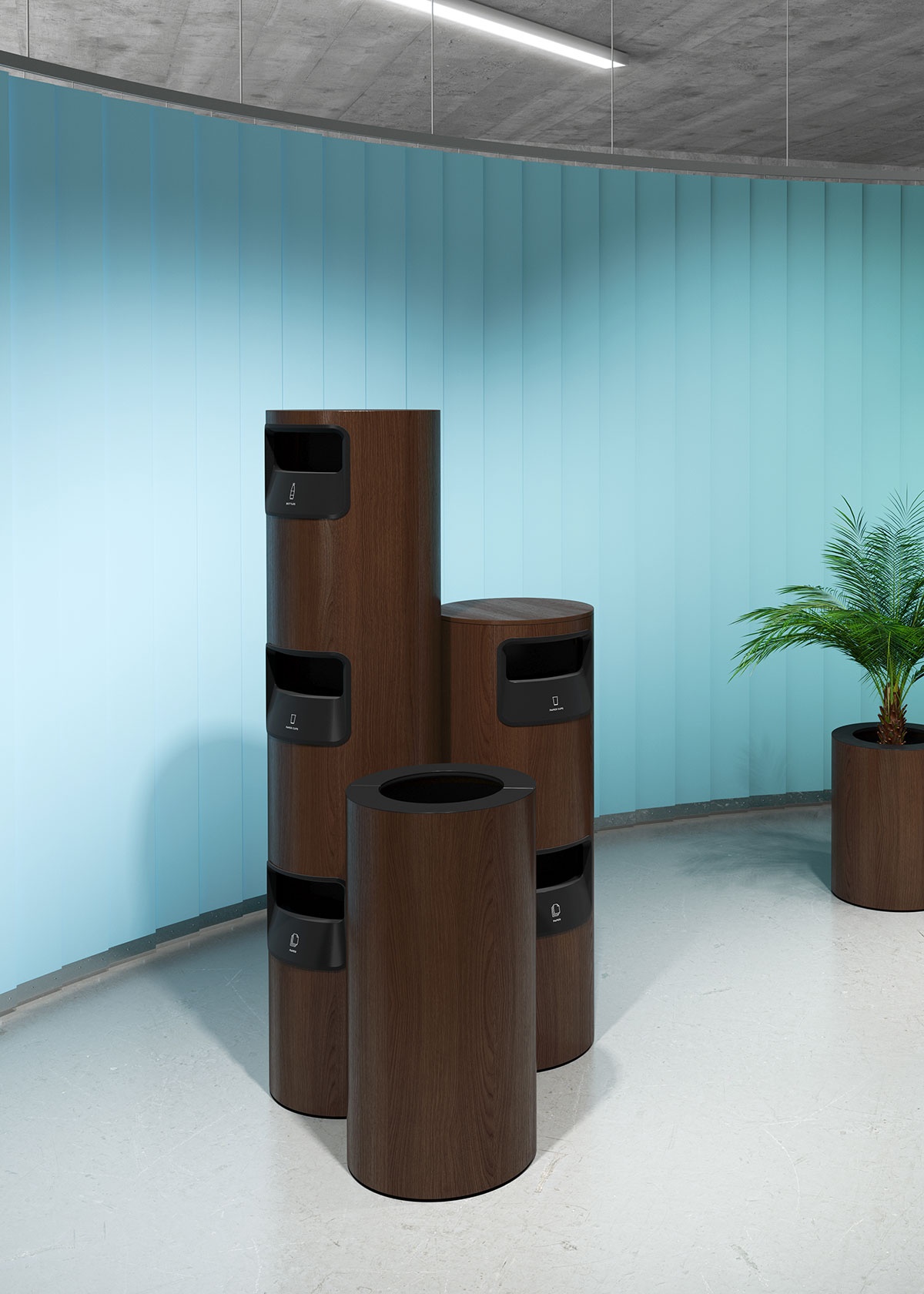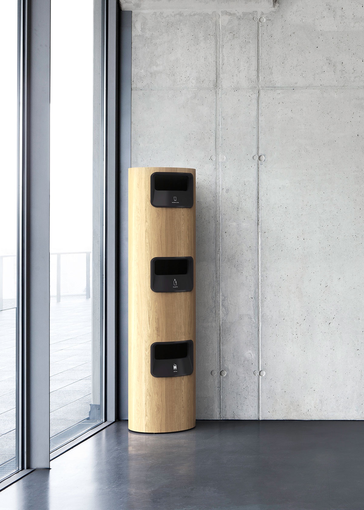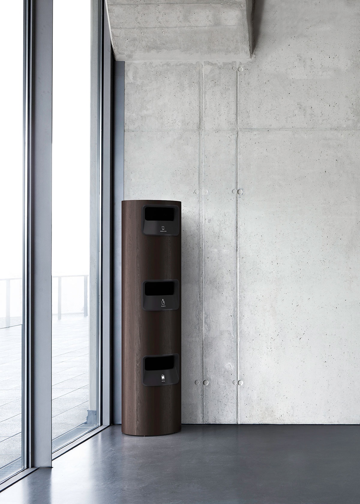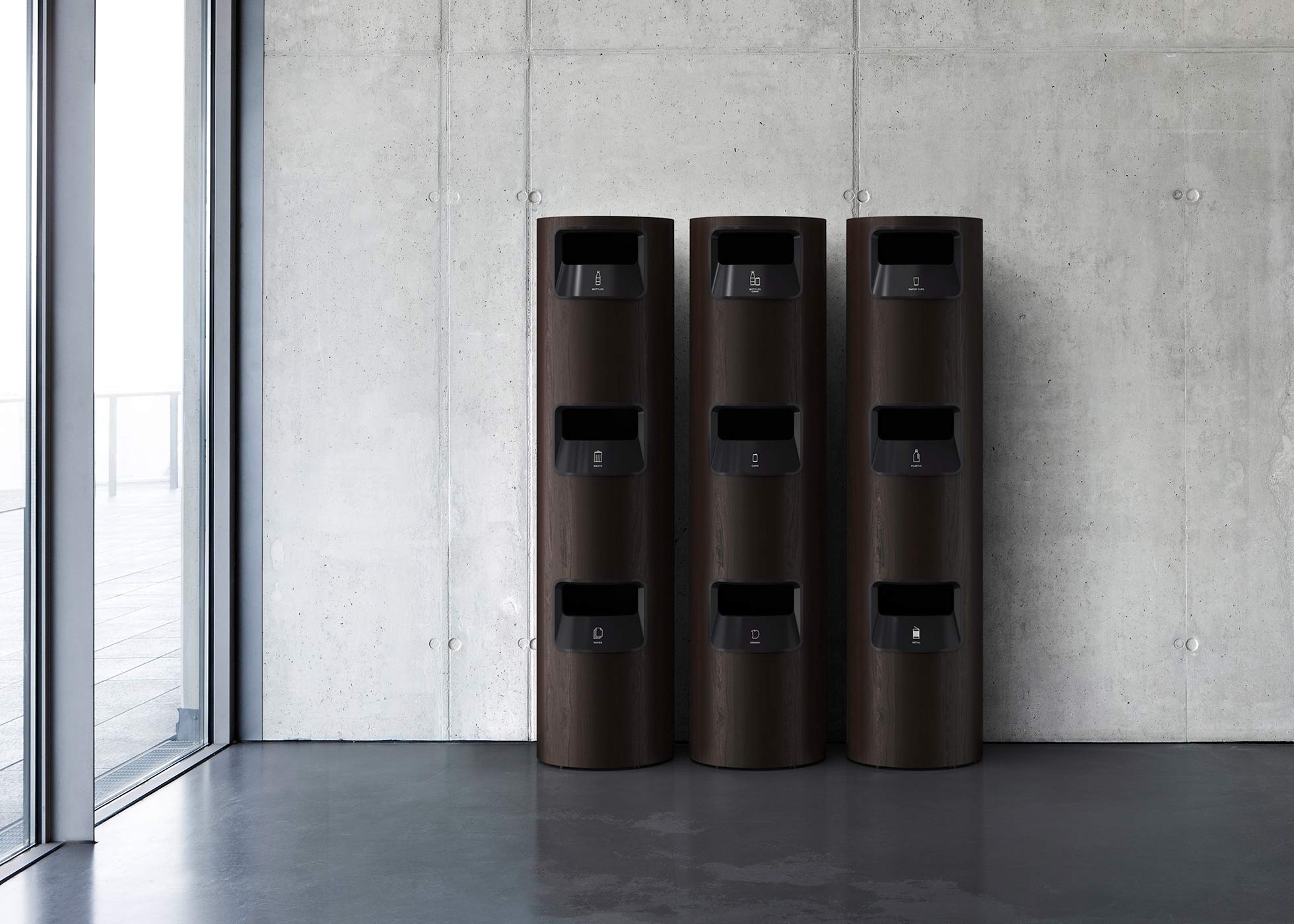 An innovative recycling bin that´s not ashamed of itself. Etage has a beautiful oak veneer frame that gives the column extra life. The oak comes in three different finishes; natural, brown black oak and white stained. In contrast to the wood and to make it easy to clean, the holes around the inlets are made of moulded bioplastic, available in white or black. The inlet is angled inwards to help guide the waste into the right container. On the larger angled surface, we have placed symbols to clarify what should be thrown into this particular bin. Inside the doors of Etage, we've formed a holder to keep the bags in place, while the container keeps the beautiful column free of dripping or leaking bags.