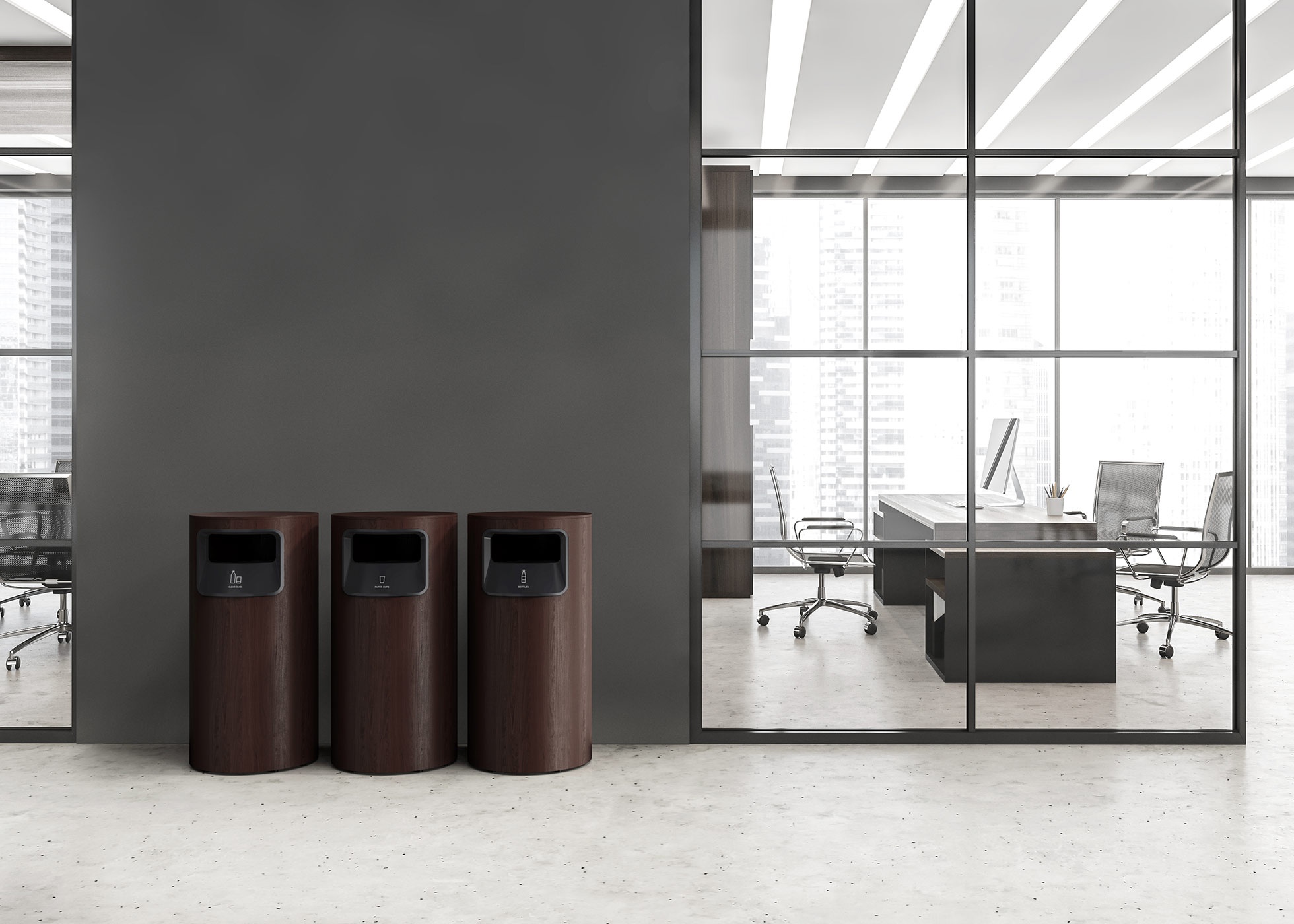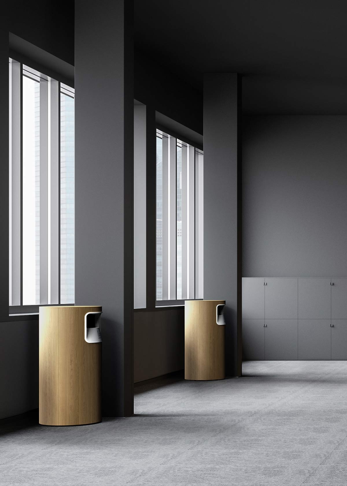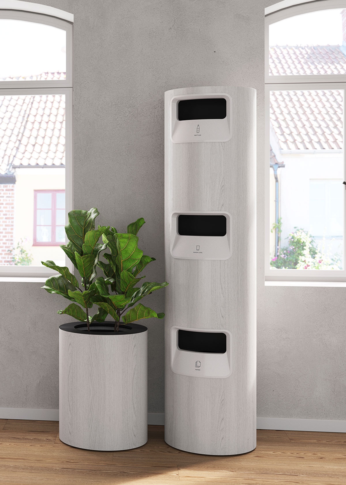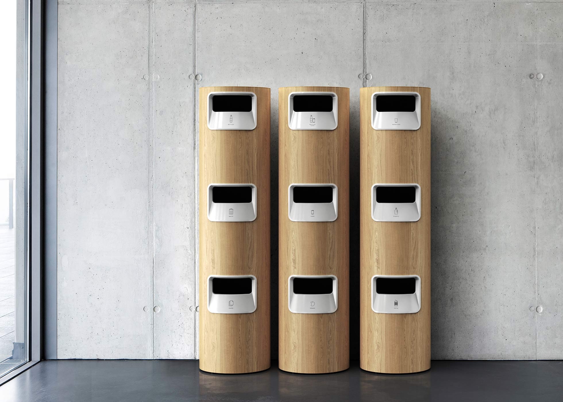 An innovative recycling bin that´s not ashamed of itself. Etage has a beautiful oak veneer frame that gives the column extra life. The oak comes in three different finishes; natural, brown black oak and white stained. In contrast to the wood and to make it easy to clean, the holes around the inlets are made of moulded bioplastic, available in white or black. The inlet is angled inwards to help guide the waste into the right container. On the larger angled surface, we have placed symbols to clarify what should be thrown into this particular bin. Inside the doors of Etage, we've formed a holder to keep the bags in place, while the container keeps the beautiful column free of dripping or leaking bags.