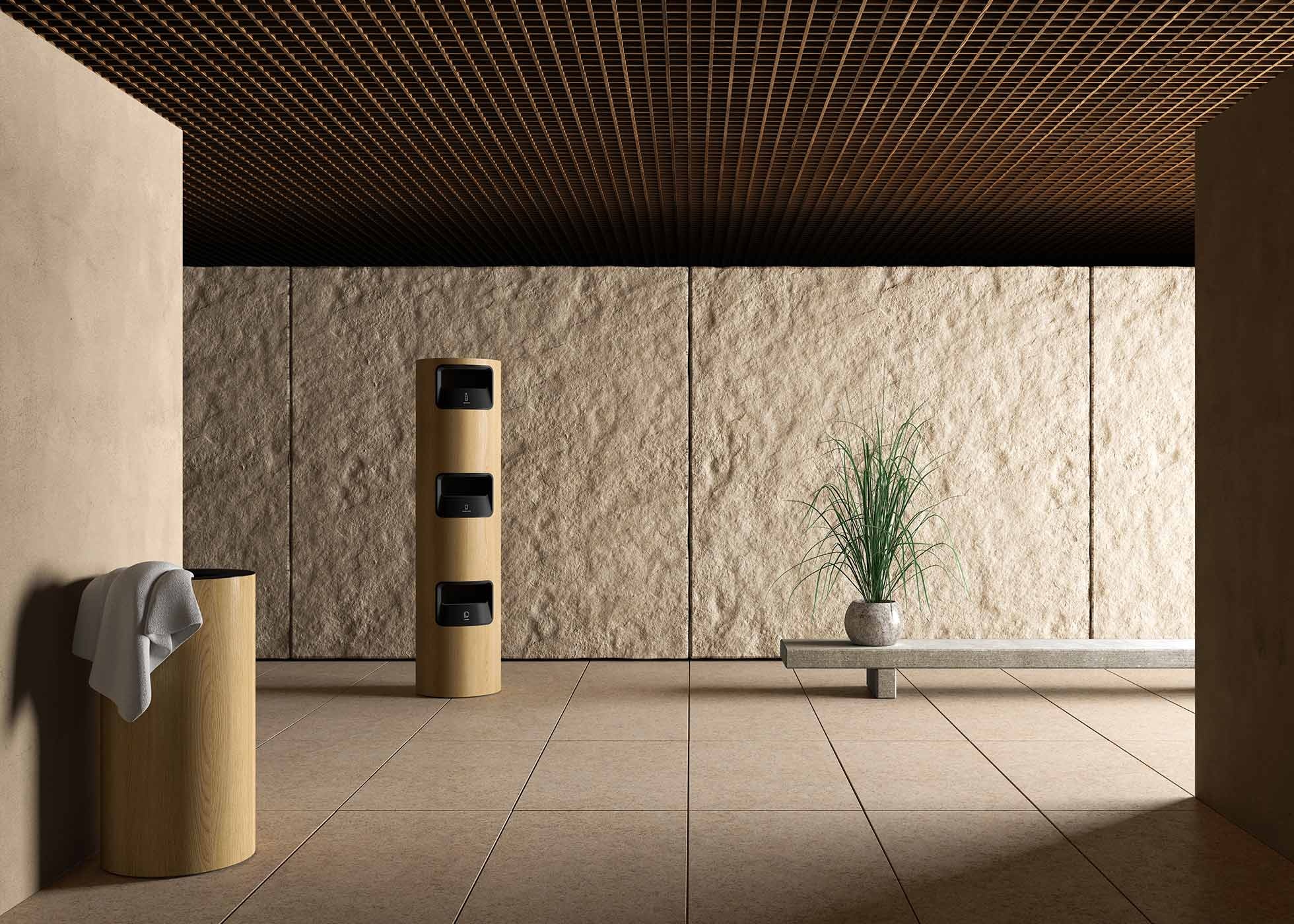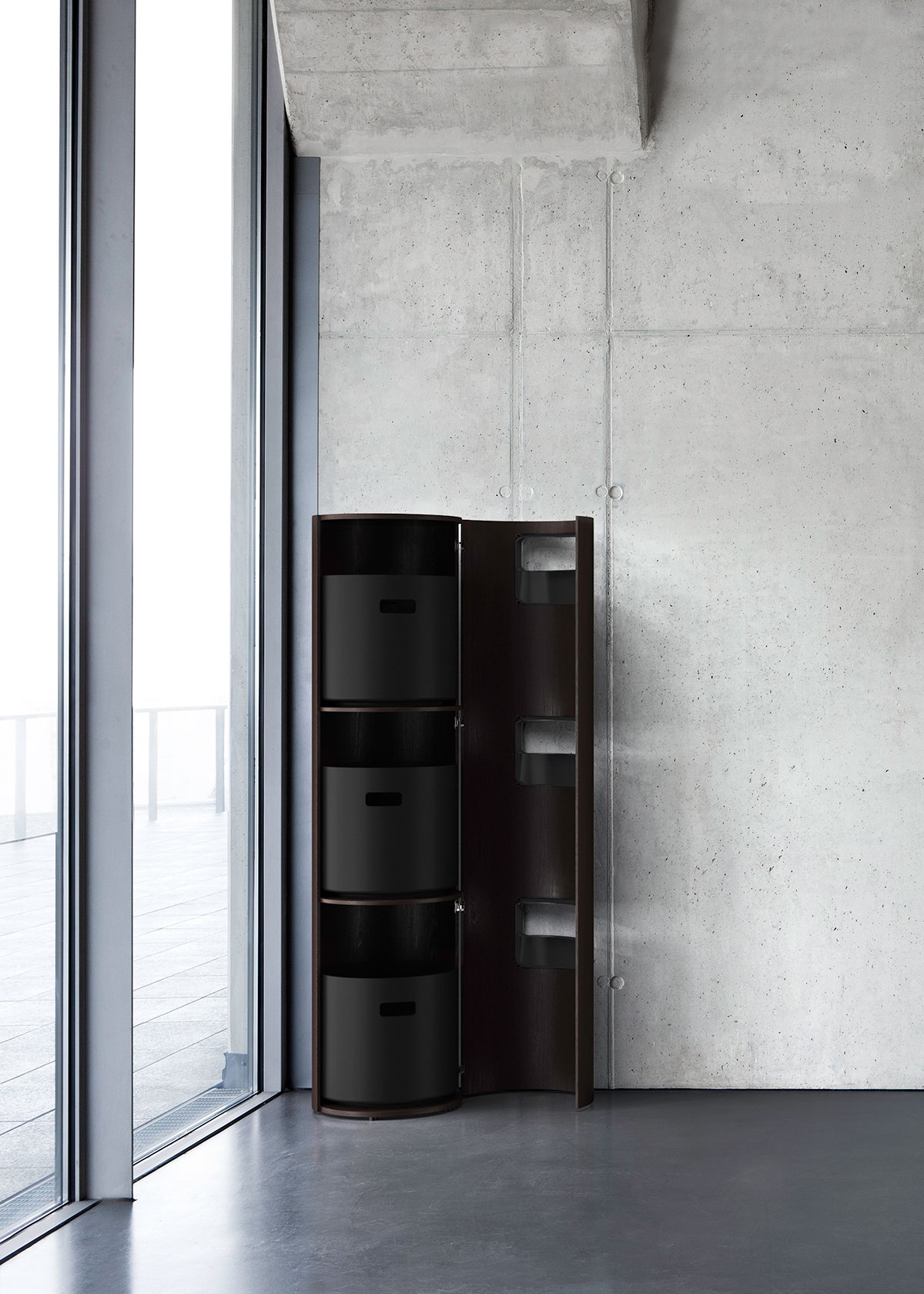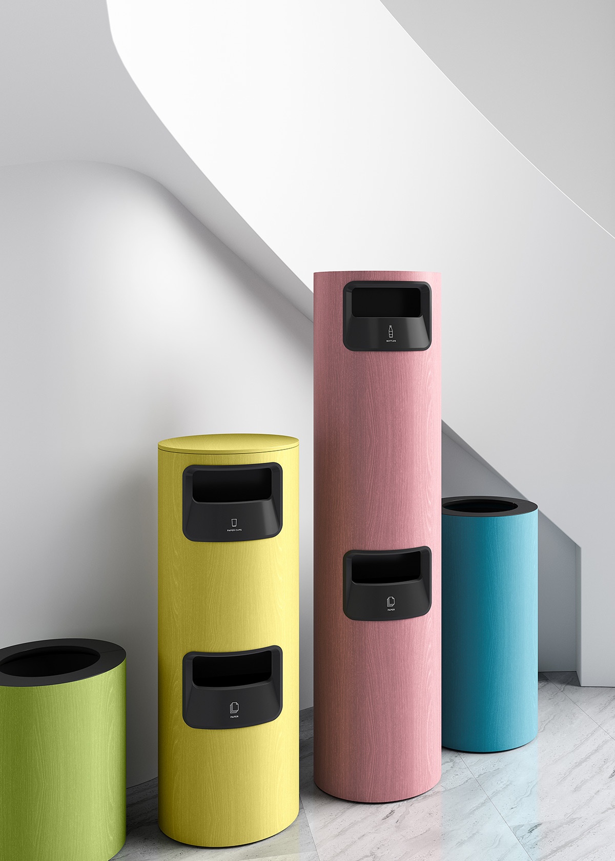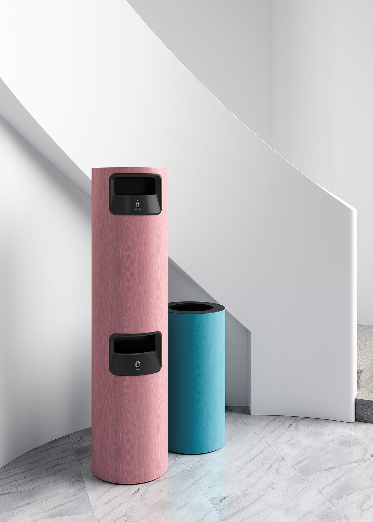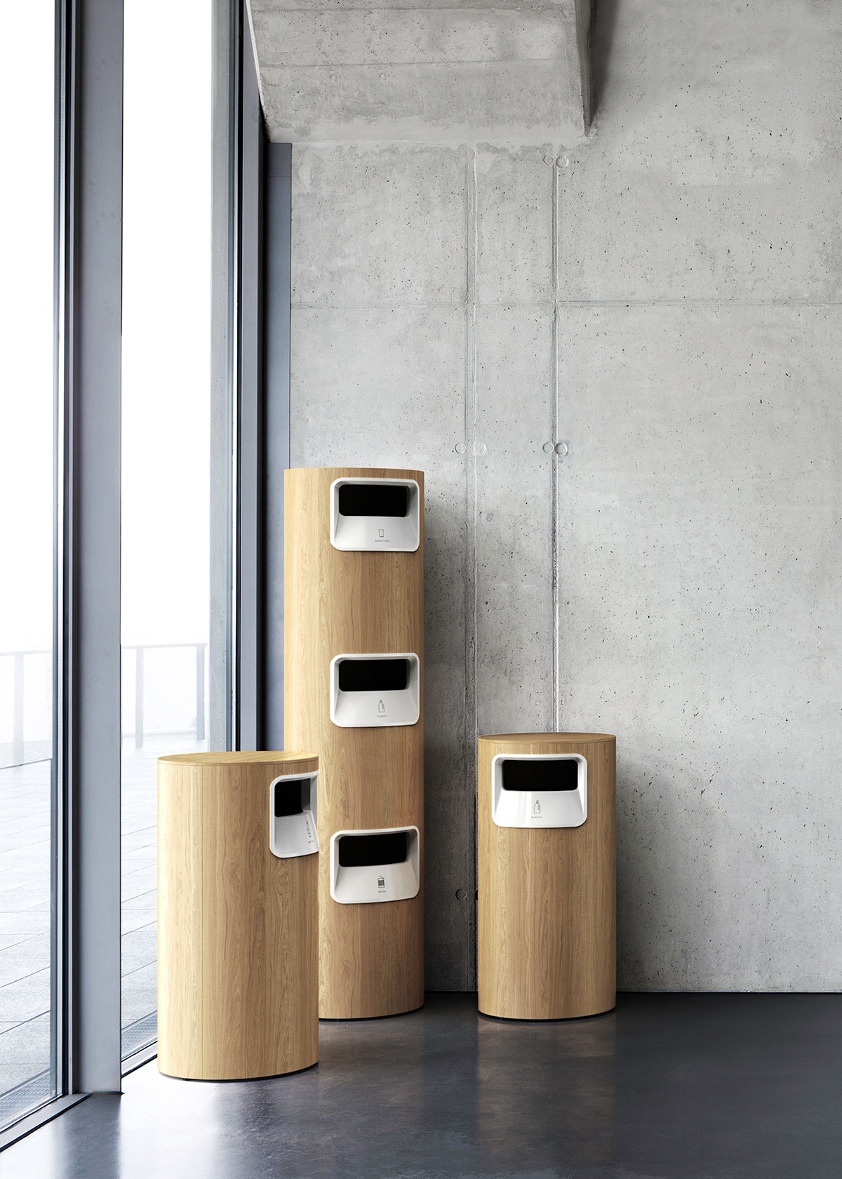 An innovative recycling bin that´s not ashamed of itself. Etage has a beautiful oak veneer frame that gives the column extra life. The oak comes in three different finishes; natural, brown black oak and white stained. In contrast to the wood and to make it easy to clean, the holes around the inlets are made of moulded bioplastic, available in white or black. The inlet is angled inwards to help guide the waste into the right container. On the larger angled surface, we have placed symbols to clarify what should be thrown into this particular bin. Inside the doors of Etage, we've formed a holder to keep the bags in place, while the container keeps the beautiful column free of dripping or leaking bags.
