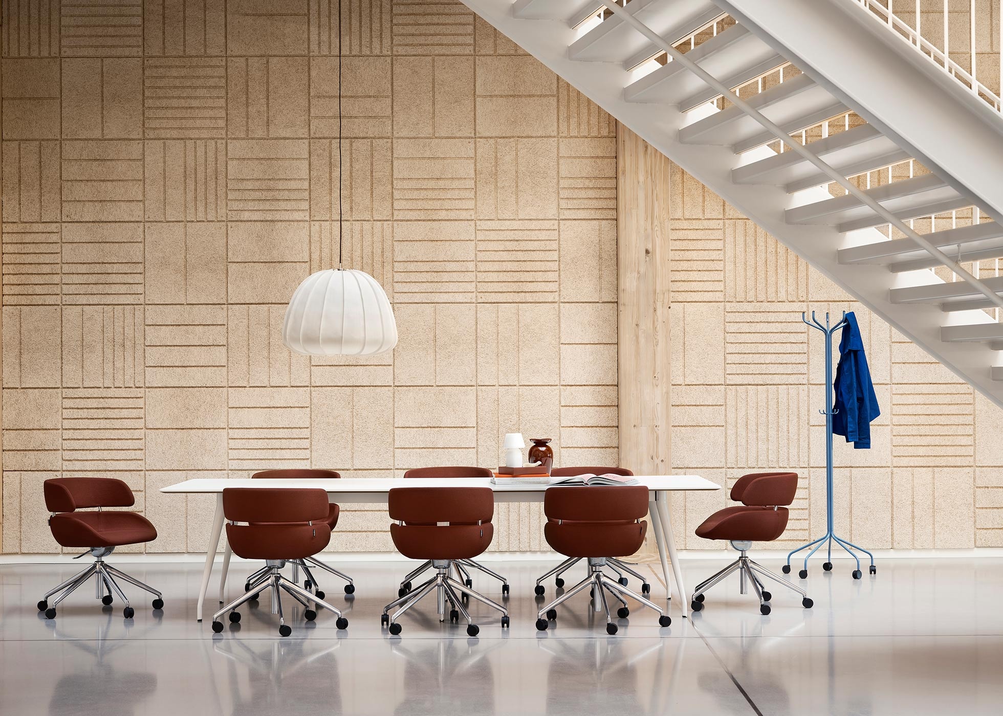 This version introduces a height adjustable base on castors, allowing the chair to adapt to more dynamic work environments. The adjustable seating position makes it suitable for different users and tasks while keeping the same embracing comfort as the original Fendo chair.