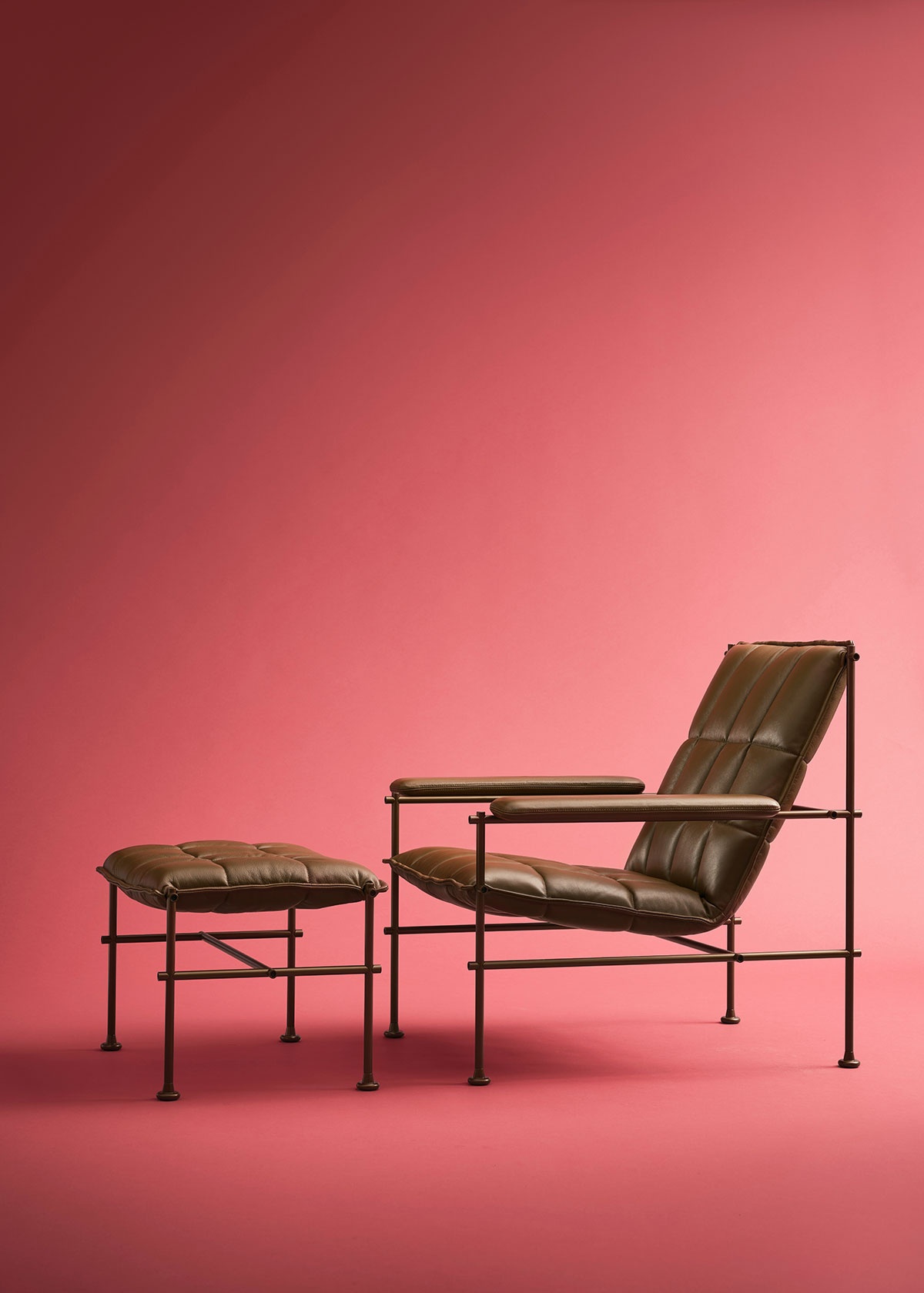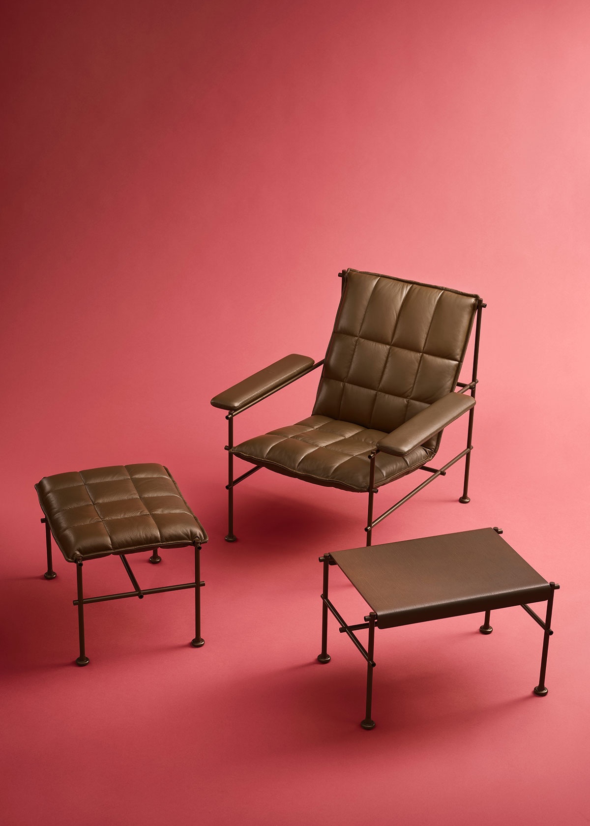 Villhem is a family of furniture built around a clear structural idea. A visible metal frame forms the construction, while different seating solutions and tables are developed within the same system.